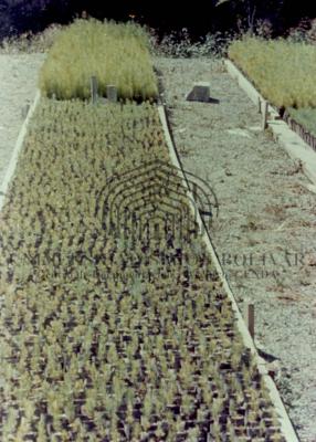 Vista de uno de los viveros de pino Caribe (Pinus caribaea var. hondurensis) ubicado dentro del Campus, destinado al programa de reforestación y arborización de las laderas del Valle de Sartenejas. Autor: Miguel Caputti. Año 1973.