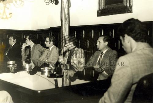 Sala Andrés Bello. 18-06-1975. Reunión de Trabajo para preparar y presentar el proyecto de la Carrera de Estudios Urbanos. En la fotografía aparecen: José Santos Urriola Muñoz, Alberto Morales Tucker, Gregorio Bonmatí, Víctor Fossi, Omer Lares y Nelson Geigel Lope-Bello.