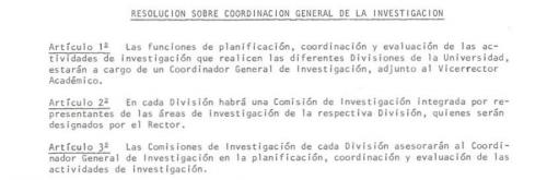 - la Coordinación General de Investigación (posteriormente elevada a Decanato de Investigación) y a partir del 26-06-1974 con el Profesor Fernando Tinoco Richter al frente de la misma;